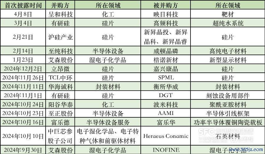 事实上,2024年9月24日“并购六条”发布以来,已有7家半导体材料公司发起9起并购。其中4家为上游硅片厂商,包括沪硅产业、有研硅、立昂微(605358.SH)、TCL中环(002129.SZ);2家提供晶圆制造原材料,包括中巨芯(688549.SH)、艾森股份;1家提供半导体封装原材料的公司,为华海诚科(688535.SH)。